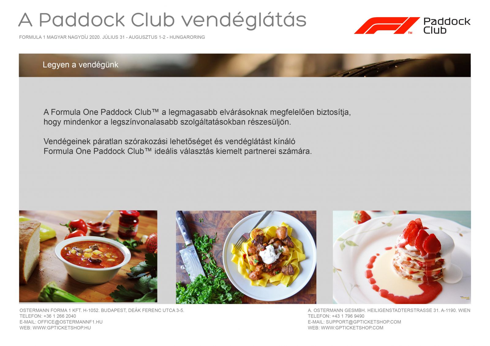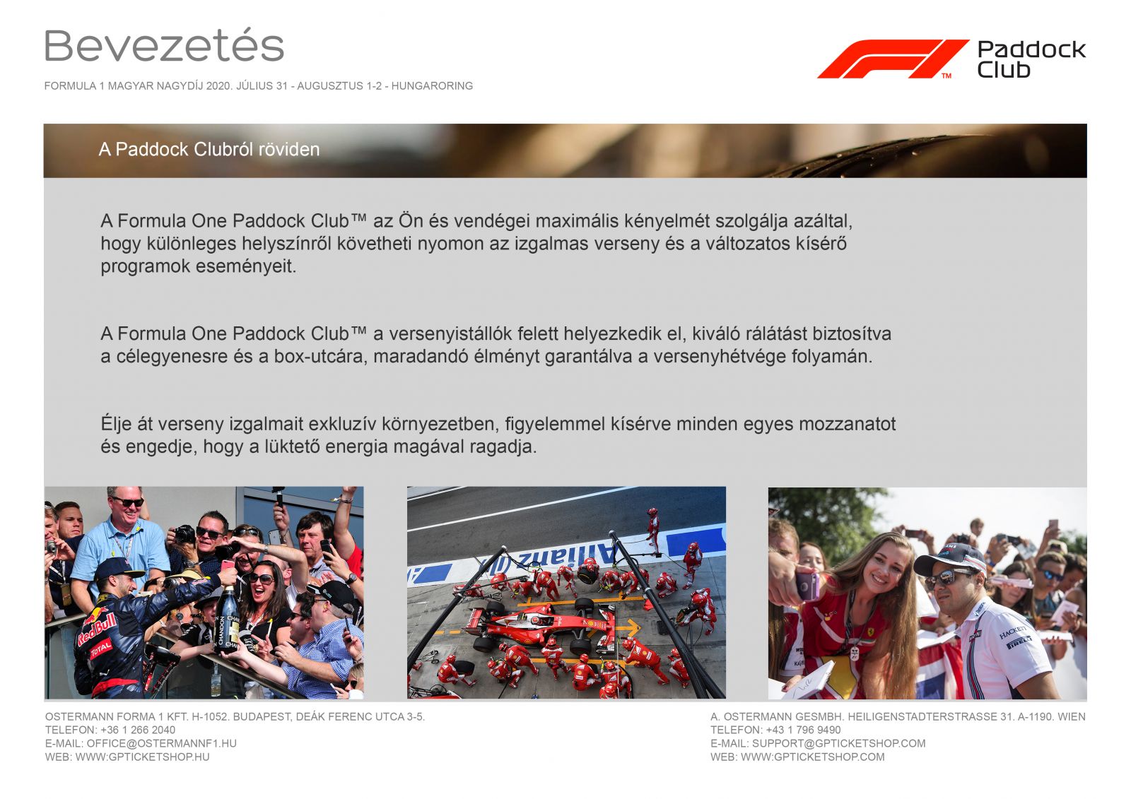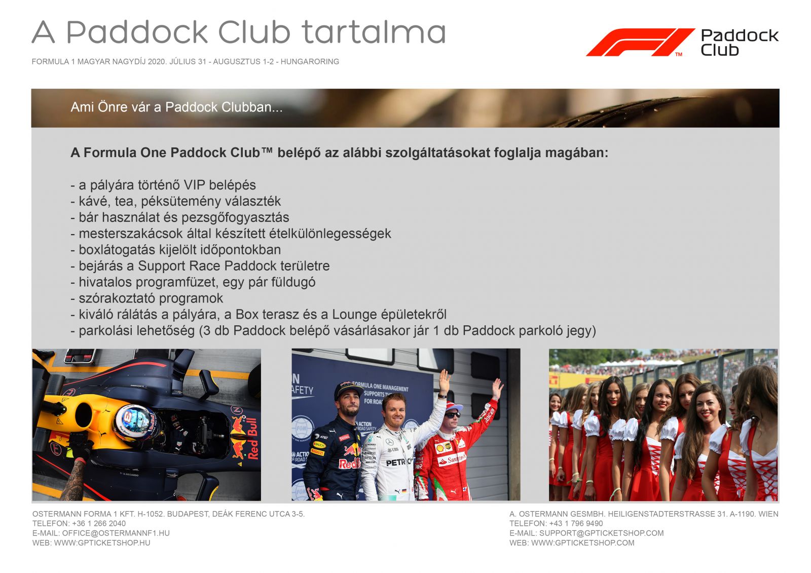 A Paddock Club jegyeket kizárólag budapesti irodánkban van lehetőség átvenni személyesen 2020 július 29-30 között. A magas értékhatár miatt kiszállítást nem vállalunk!